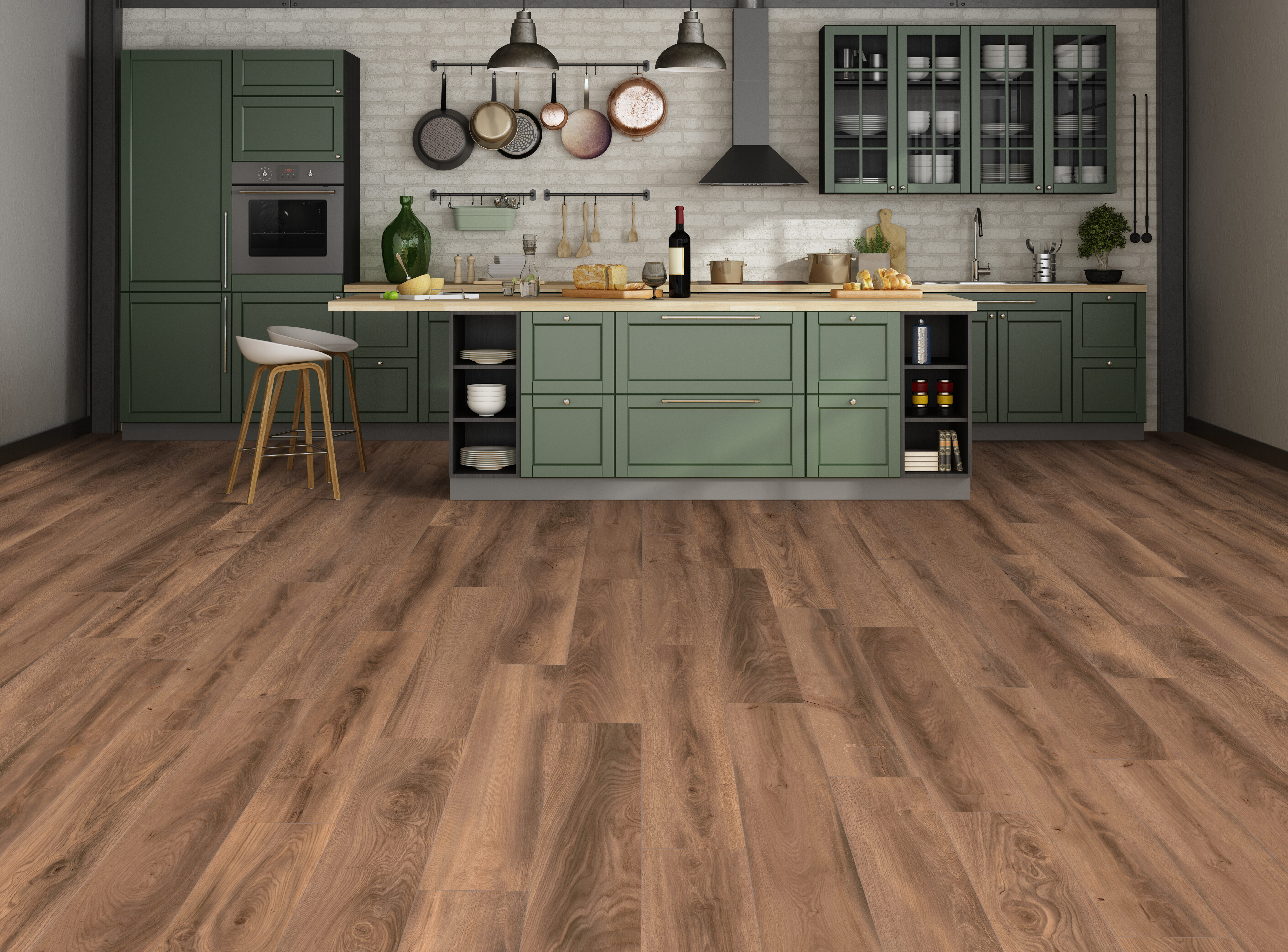 Deep greige or toasted walnut LVP + navy or matte black cabinets. High contrast, dramatic, and surprisingly practical for hiding dust and pet hair. Pro tip: Wider plank LVP styles can make smaller kitchens feel larger and more open.